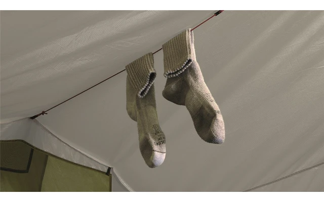 Depuis la tente intérieure, il y a un accès à un espace de rangement supplémentaire à l’extrémité de la tente. Cet accès est muni d’une fermeture éclair. Ces possibilités de rangement sont complétées par des poches en filet et une corde d’équipement.